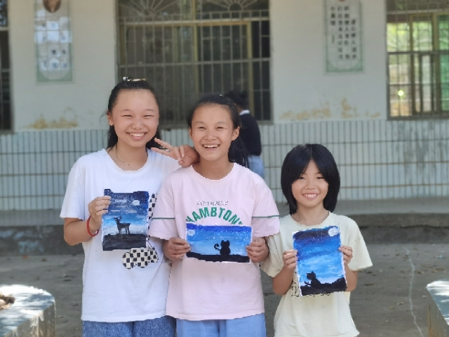 在课上刘巧玲通过狼牙山五壮士的绘画向同学们介绍了三角形构图,介绍三角形构图的作用,通过绘画椅中圣母介绍圆形构图,通过绘画瓶花与香蕉介绍梯形构图。刘巧玲给学生分发画笔、画纸与颜料,让同学们用正方形与三角形构图模仿课件给出的图片进行绘画,孩子们将绘画加上自己的想象创造出了不同风格的设计,在最后将同学们的绘画作品进行展示。孩子们与自己的作品合影留念。