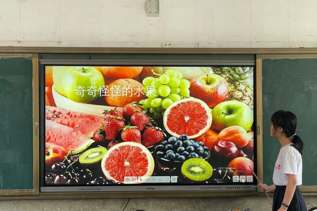 上课开始时,为了激起同学们上课的兴趣以达到更优的教学效果,贺瑶以播放水果纪录片的形式进行课堂内容导入。通过向同学们进行提问,贺瑶对生活中常见的水果进行了简单的介绍。此外,贺瑶将授课重点放在了来自其他不同地域的奇特水果。同学们积极互动并表示自己对水果有了不一样的认识。