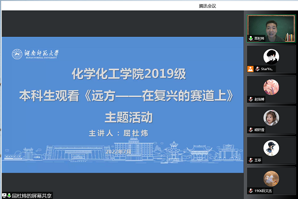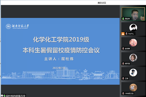 此次会议中,屈杜炜着重强调了暑假留校的疫情防控工作,提醒同学们要积极配合学校疫情防控工作,严格遵守长沙市防疫要求,有行动要提前向学校报备,按要求进行核酸检测。最后,2019级同学观看视频《远方--在复兴的赛道上》,增强了同学们的责任担当意识。