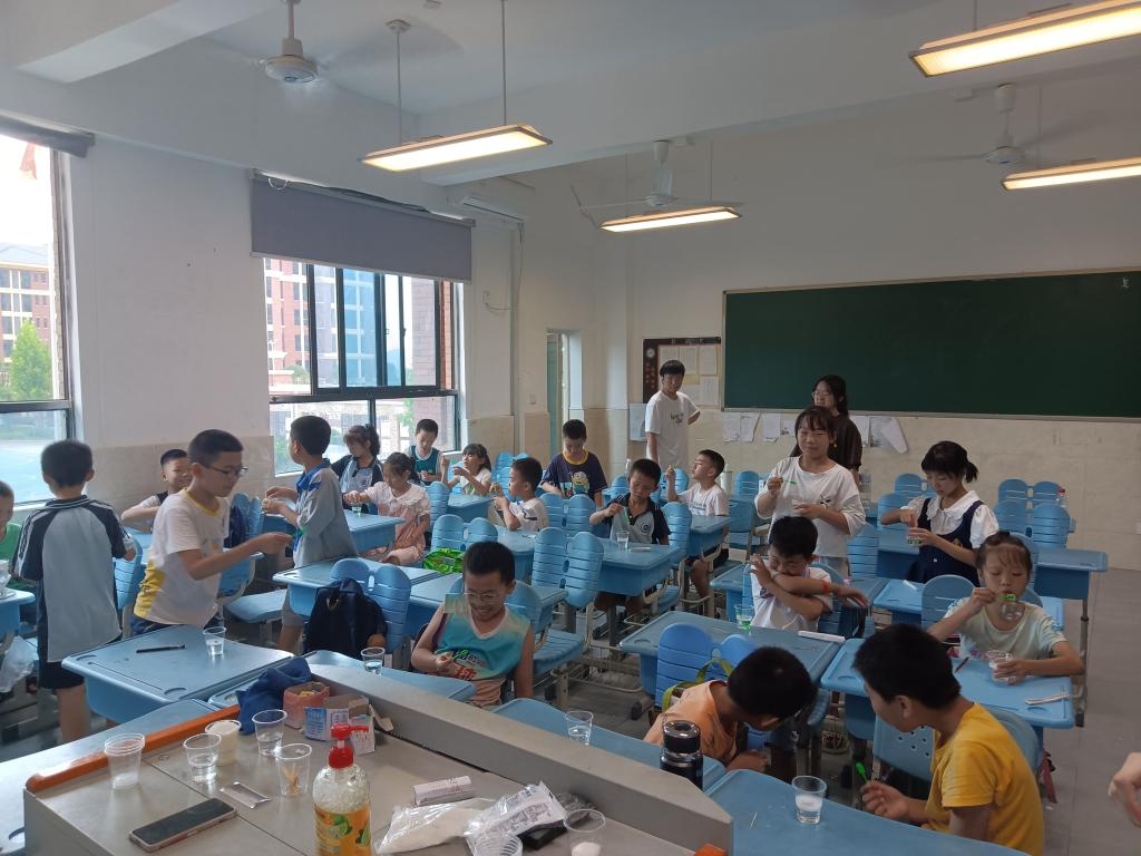 为了让同学们切实体会到化学的魅力,锻炼同学们的动手能力,在唐永荭的指导下,同学们准备了两个混有少量洗洁精和水的杯子,部分同学选择在其中一个杯子中加入四勺白糖,其余同学加入一勺盐。之后同学们分别用自己面前的两份液体吹泡泡,实验结果表明,加入糖的液体吹出的泡泡相对初始液体吹出的泡泡较大,而加入盐则相对较小。