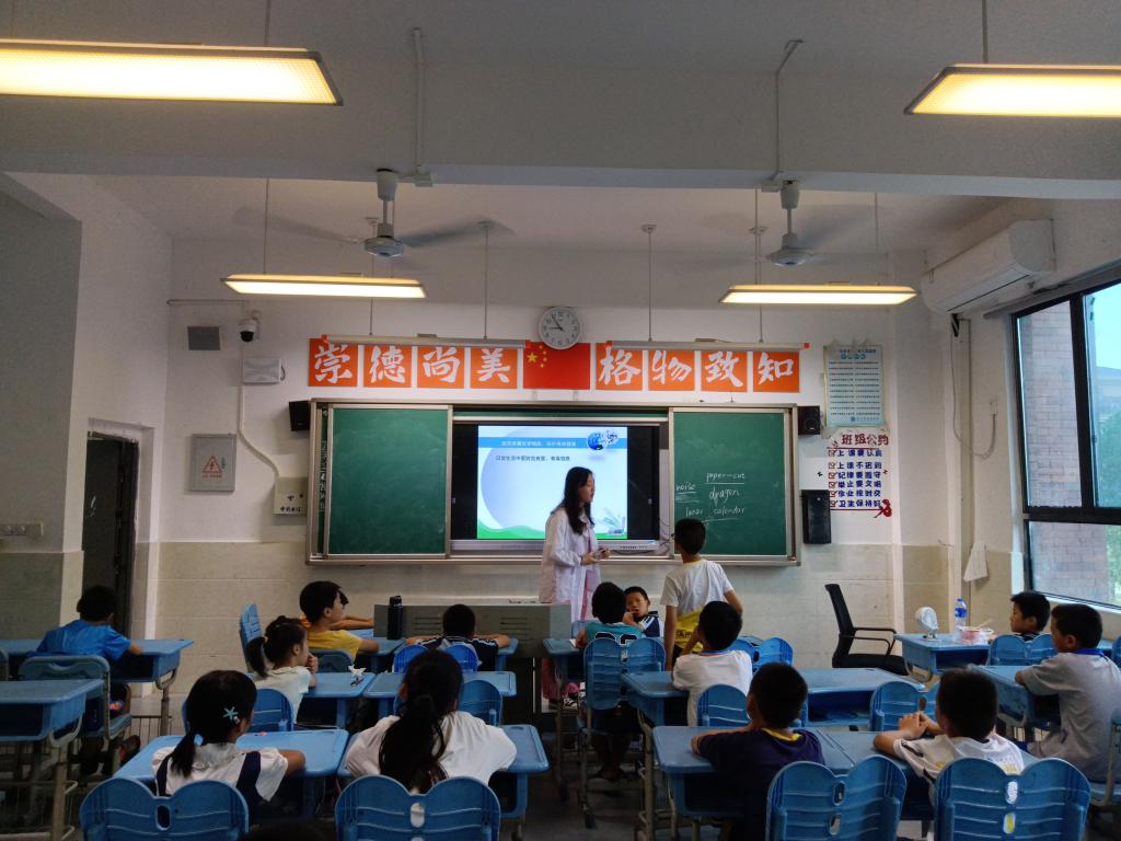夏思晴首先从人体中的化学元素导入课堂,分别讲述了人体中的钙、铁、锌、硒、碘、钠、钾、氟等元素,重点强调了缺乏这些元素时将会引发的疾病,并告诉同学们可以通过哪些食物补充以上元素。随后,夏思晴提出了一系列有趣又贴近生活的相关问题,例如“香蕉没熟怎么办”、“如何鉴别'坏蛋'”、“如何消灭家庭果蝇”等,这些问题都可以基于化学知识通过一些简单的方法得到解决。