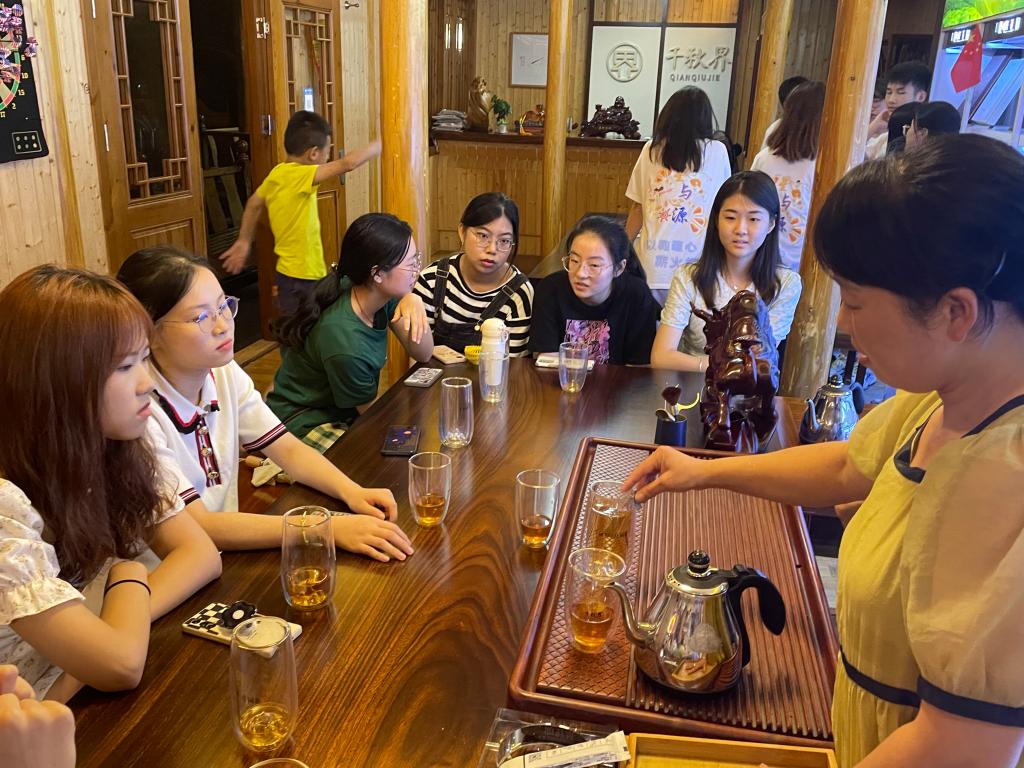 安化县马路镇作为“万里茶道”的起源地之一,素有“古道茶乡”的美誉。活动现场,千秋界茶庄工作人员以安化黑茶历史拉开序幕,向队员们演示泡茶流程和沏茶方法,再从茶的起源、茶的分类、茶的冲泡、茶礼仪等有关茶的知识进行讲解。在此基础上,队员们试饮当地特色茯砖茶,工作人员向队员们描述茯砖茶被誉为“生命之茶”,是中国历史上最早出现的紧压茶,是黑茶中极具特色的茶品,具有降三高、去油腻、助消化等功效。此次活动在四溢茶香之中落下帷幕。