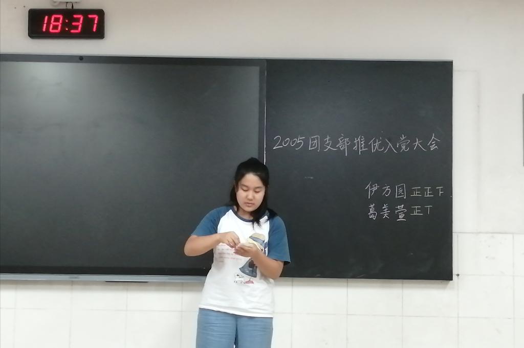 活动伊始,黄诗然介绍了此次活动的主要内容和目的。候选人伊方园、葛美萱依次进行自我陈述,其他团员对两位候选人进行了有关党的相关知识的提问,黄诗然组织2005班全体同学进行无记名投票。提问结束后进行了现场唱票,并公布投票结果为伊方园13票,葛美萱7票,伊方园获得了2005班团支部推优入党的名额。