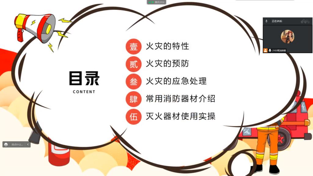 (通讯员 刘依婷)9月21日下午13时,伟德国际19492103班团支部在腾讯会议开展以“消防安全”为主题的团日活动,此次活动由团支书刘依婷组织开展,2103班全体同学参与。
