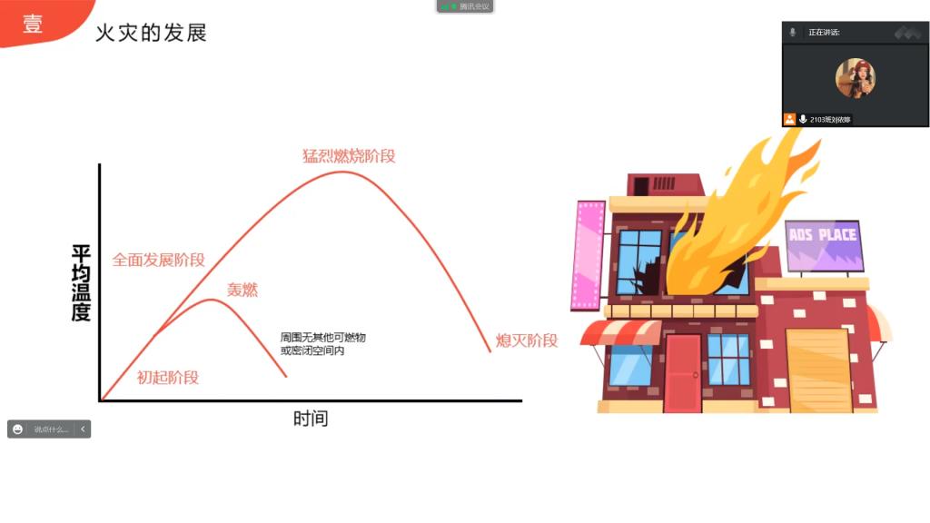 活动伊始,由团支书刘依婷介绍活动主题,强调此次活动的意义,接着从火灾的特性、火灾的预防、火灾的应急处理、常用消防器材介绍和灭火器使用操作五个方面展开了解,并且通过视频新闻加深同学们对消防安全重要性的了解。活动的最后,团支书刘依婷邀请同学分享感悟,从同学的发言中可以感受到同学们有了对消防知识的进一步了解。