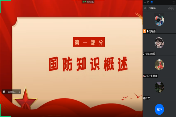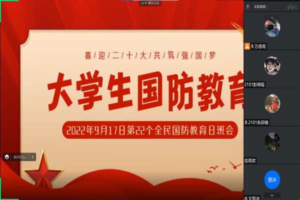 (通讯员 黄蕾)2022年9月17日19时,伟德国际19492101班全体成员在腾讯会议上举办以“国防教育”为主题的线上团日活动。此次活动由团支书万思雨主持,2101班全体成员参加。