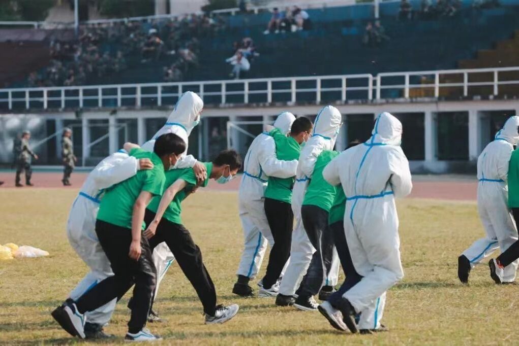 警报声响,核泄漏事故“发生”,生化防护演练开始进行。化院学子身着防护服,快速、有序地赶往“事故”发生现场,开展抢救与消杀工作,生动体现出化院学子以学科知识助力社会发展的精神面貌。警示同学们铭记历史,珍爱和平。