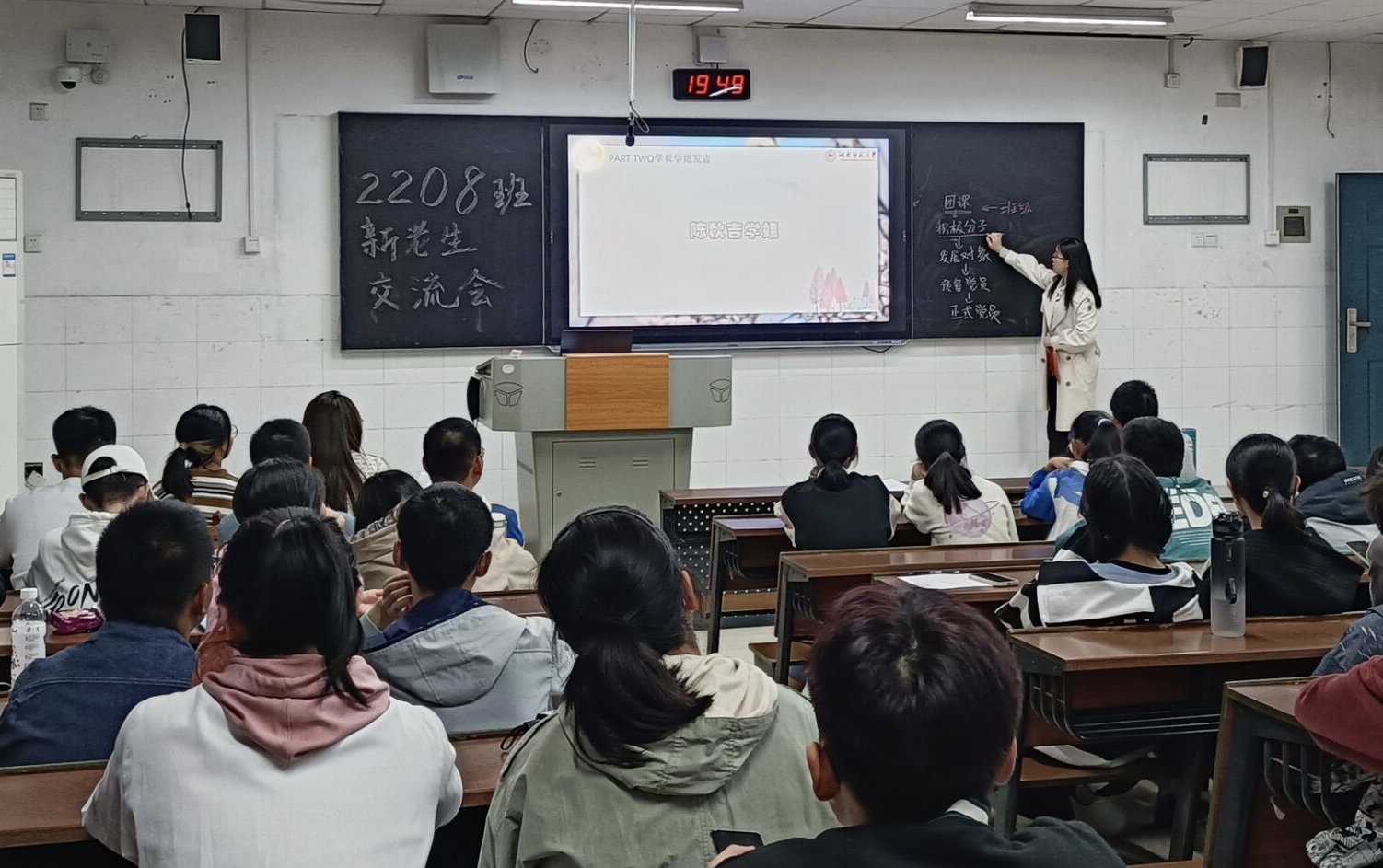(通讯员 唐继彧)10月5日19点30分,伟德国际19492107班同2208班于至善楼307教室开展新老生交流会。活动由2208班学习委员孙卓成主持,交流会主要由“你画我猜”小游戏和学长学姐答疑两个部分组成。
