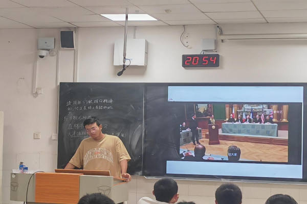 班级团支书从新旧中国的外交作为切入点,分别展示了旧中国以及一系列弱势国家“弱国无外交”的羸弱局面和新中国由于国力发展迅速带来的国际地位提升,并向2209班全体同学展示新时代中国取得的一系列科技、经济等方面的伟大成就,
