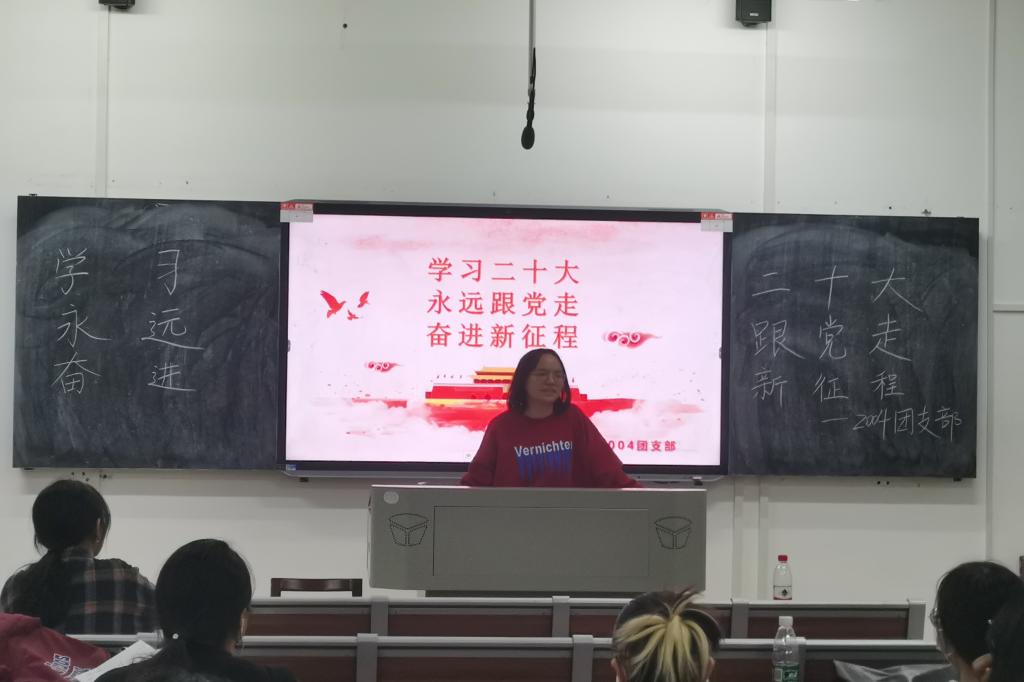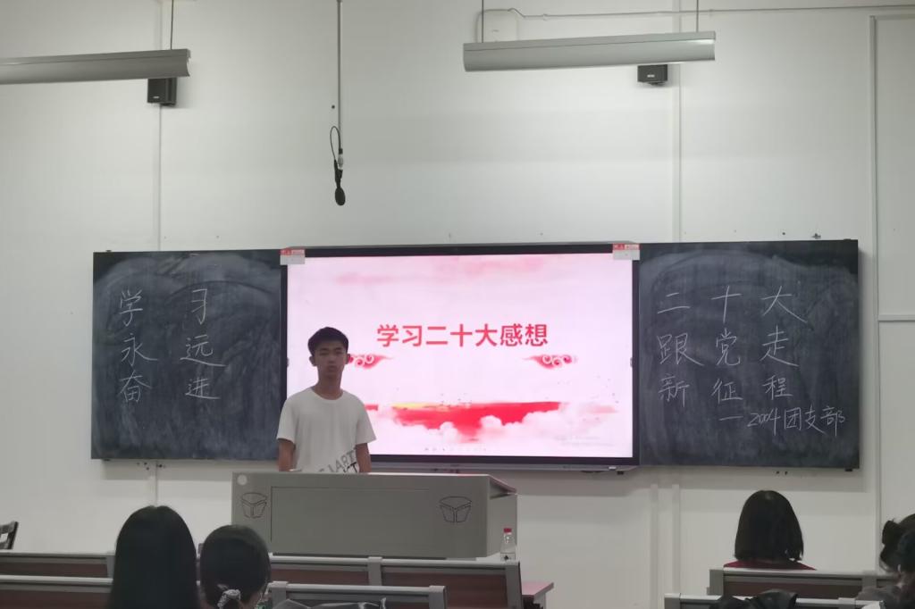 活动伊始,肖佳慧引导大家回忆二十大的内容,对此次活动主题进行阐述分析。此环节结束后,肖佳慧从四个方面——党的二十大介绍、二十大精神(含报告)解读、《中国共产党章程(修正案)》修订主要内容以及习近平总书记主持大会并发表重要讲话精神学习,来开展此次团日活动,加深了支部成员对二十大的理解,提高了对党、对国家的尊敬与拥护,思想上更向党组织靠拢。活动最后预备党员吴昊上台分享感想,起到了模范带头作用。