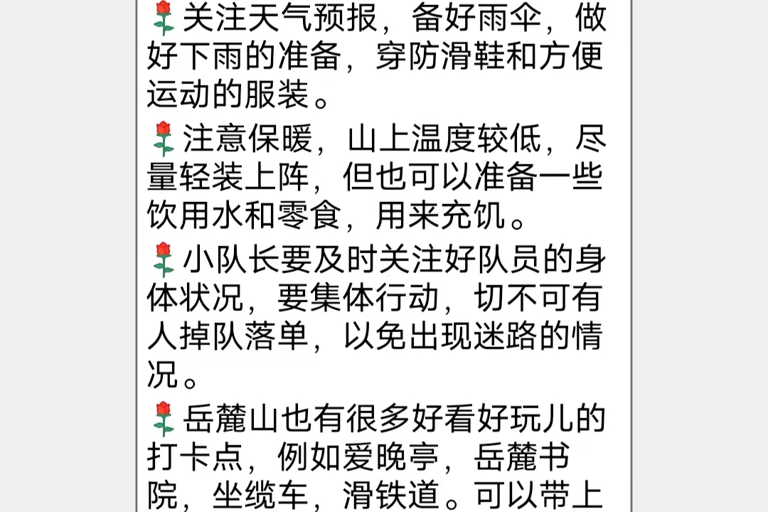 活动伊始,朱伶俐在岳麓山探险小队的QQ群中向小队长们强调了登山时的注意事项和安全的重要性,呼吁同学们在进行岳麓山探险活动时互帮互助,互相关照,团结友爱。朱伶俐还建议同学们在岳麓山探险活动开始前考虑天气、着装等各方面因素,做好充足的准备,小队长关注队员的身体状况,大家集体行动,结伴同行,不掉队,不落单,防止迷路的现象产生。