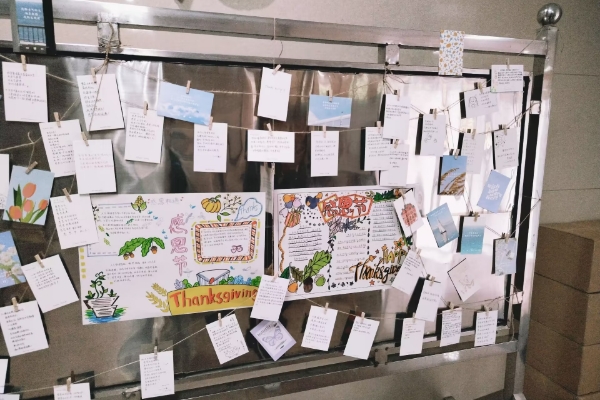 活动开始前,田静和王思雨安排各志愿者错峰前往化学楼二楼报告厅,并安排志愿者有序签到。活动开始时,田静组织志愿者画黑板报,王思雨组织志愿者写贺卡。黑板报内容与贺卡内容都与感恩节有关。活动结束后由田静和王思雨在化学楼一楼大厅布置并装饰展示板,并计划将此次活动成果保持至11月24日12时。