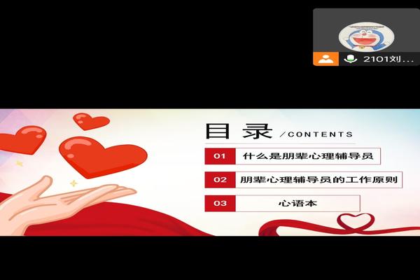 此次会议从“什么是朋辈心理辅导员”,“朋辈心理辅导员的工作原则”,“心语本”三个方面说明了朋辈心理辅导员的意义和原则。体现了学院及学校对学生心理健康的关心,有助于及时发现并协力减轻同学的心理负重及心理创伤。在会议开展之前,健服部第一负责人刘日晗在QQ群里发放会议通知,各“朋辈心理辅导员”及时回复并参加了此次会议。会议中,刘日晗以图片,文字等形式说明了“朋辈心理辅导员”的重要作用及工作要求并在最后会议总结中表达了对各“朋辈心理辅导员”的期待。