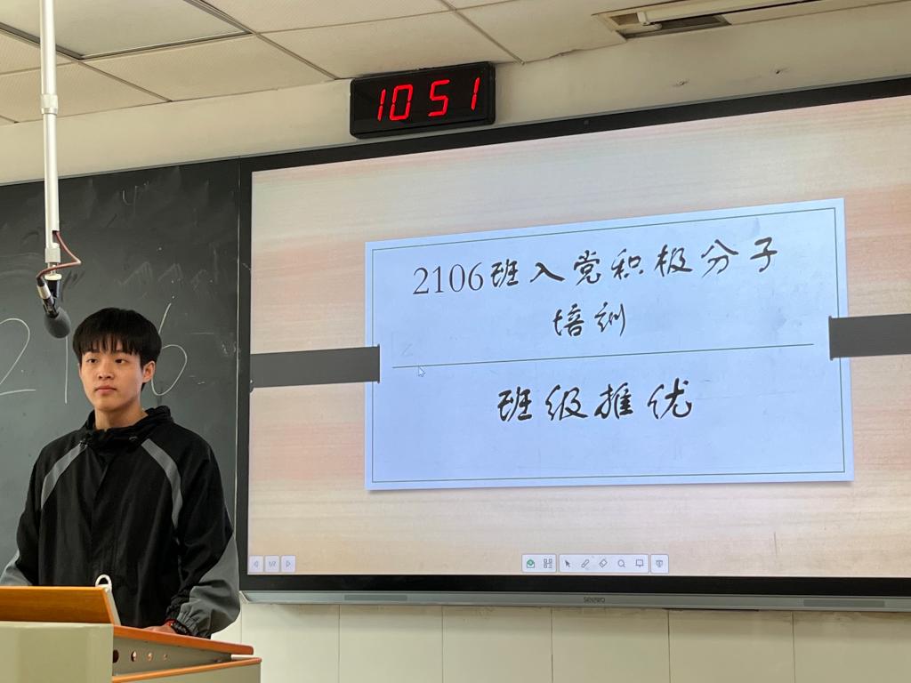 五位同学分别就对中国共产党的见解以及入党后对自己的期望要求做出了系列发言,向参会同学阐述了他们各自的能力及未来畅想,并在发言结束后郑重承诺,在加入中国共产党后不忘初心,谨记忠于党和人民,不吝奉献出自己的青春。在一番权衡讨论后,2106班“入党积极分子推优”最终推优名单为:唐彬、陈伊睿、谭进杰、张桂荣、周鹏程。此次入党积极分子推优会议到此结束。