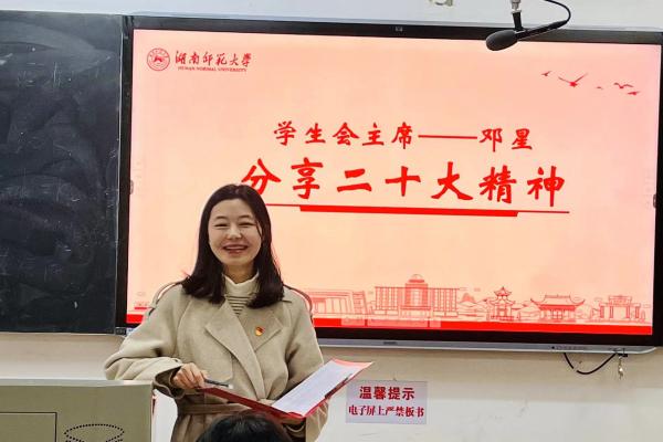 第二部分,由学生会主席邓星分享党的二十大精神学习心得。邓星紧密结合党的二十大报告和国家取得的重大成就,向学生会成员阐述了二十大报告中的若干重要新表述、新论断,并重点讲解了二十大报告中习近平总书记针对广大青年的讲话内涵,帮助成员们充分认识到作为新时代青年,大家应做好接过时代重任的准备,砥砺前行,奋发进取。