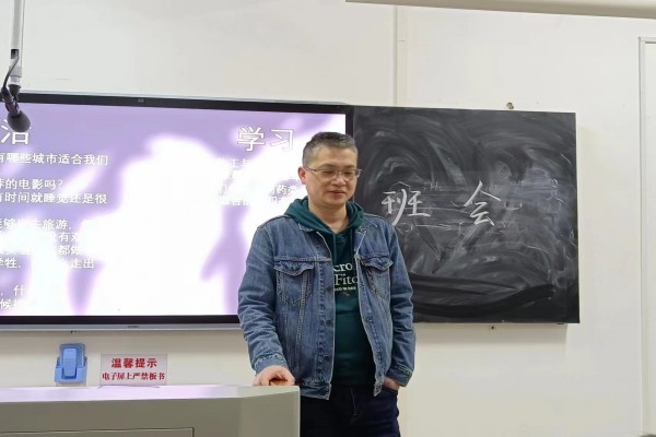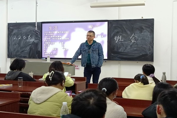 经班会前期流程安排,会议有序进行。杜邵龙首先向同学们正式问好,并针对上学期成绩不理想的同学提出建议和未来期望。杜邵龙建议同学们对上学期学习生活进行适当总结,对新学期做出规划。2206班心理委员王天一在会前收集同学们生活和学习上的相关问题,杜邵龙在会中一一作答。其中,杜邵龙着重强调大学生活的意义在于充实大学生活,使其更有价值,不要虚度时光。在最后的自由提问环节,同学们询问有关未来就业、专业前景等问题,杜邵龙与同学们探讨相关信息,为同学们的未来就业提供建议与方向。