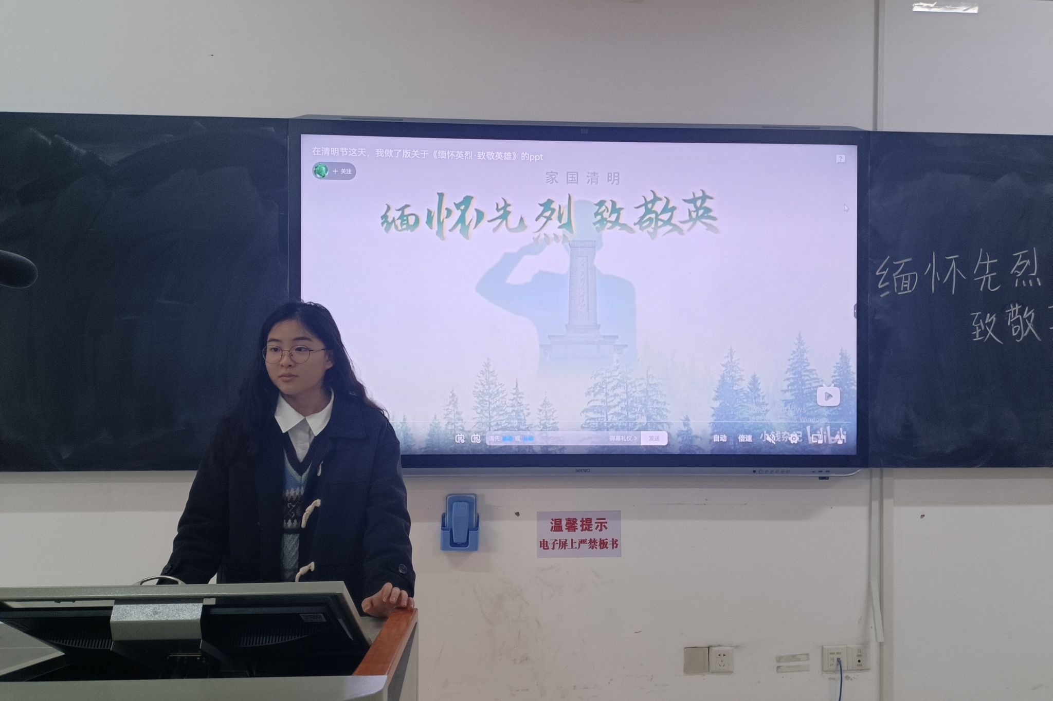 会议开始前,由2107班班长易宇洋组织同学们入场并签到。陈秋吉向同学们简单介绍了本次团日活动的主题,接着组织同学们一同观看“缅怀先烈,致敬英雄”视频,视频播放期间,同学们均严肃认真,用心体会英雄业绩、学习英雄精神。观看结束,陈秋吉对本次团日活动作出总结:身为当代青年,我们在这片红色的土壤上被滋润、被哺育,当以少年意气、芳华正茂,用最赤诚的热爱与信仰报效祖国!活动结束后同学有序退场。