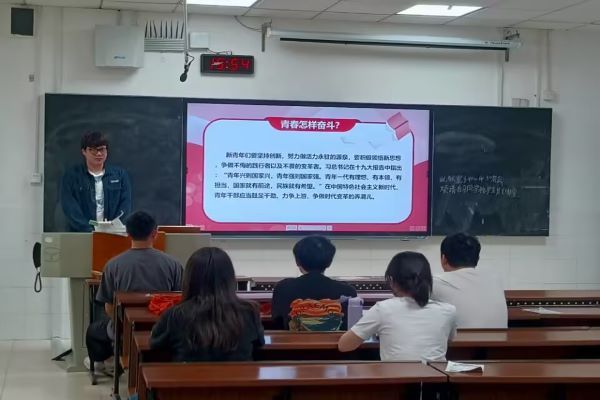 首先,马天皓对党的二十大精神作简要介绍,就深刻把握新时代十年伟大变革的里程碑意义、开辟马克思主义中国化时代化新境界和以中国式现代化全面推进中华民族伟大复兴等作具体解释。党的二十大精神介绍完毕后,马天皓通过新青年“青春为什么要奋斗”引导班级同学深刻思考,以“青春怎样奋斗”号召同学们激扬青春力量。