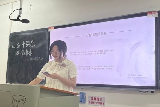 在此次活动中,在团支书陈伊睿的介绍下,支部成员学习了陕西姑娘邢小颖高职毕业后在清华大学担任实践教学指导老师的事迹,厚植家国情怀、涵养进取品格。陈伊睿以PPT的形式,从邢小颖19岁那年在清华当实习老师的经历、邢小颖用实力回应质疑、邢小颖的未来新目标三个角度介绍了这位青年的奋斗故事,号召支部成员以奋斗姿态激扬青春,不负时代,不负年华。支部成员均认真观看,心生感触,立志以青春之我、奋斗之我,为中华民族铺路架桥,为祖国建设添砖加瓦。奋斗是青春最亮丽的底色,行动是青年最有效的磨砺。有责任有担当,青春才会发光。