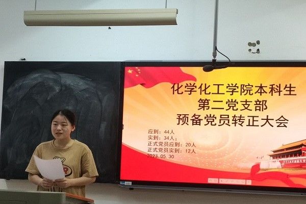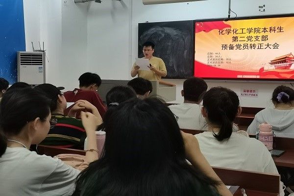 (通讯员 余思宇)2023年5月30日,化学化工学本科生院第二党支部于化工院210教室召开预备党员转正大会,讨论了关于刘子璇等12名同志申请转为正式党员的问题。参加此次会议的有十二名正式党员,以及20级和21级部分预备党员。此次大会由本科生第二党支部书记姜文滔同志主持。
