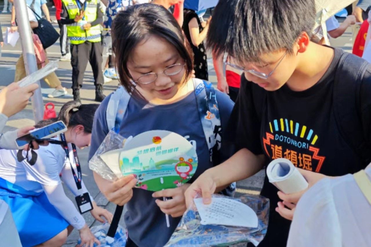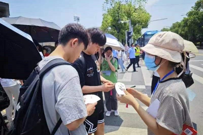 志愿者于6月6日中午在至善楼106教室提前制作了纸扇,有的在纸扇上自创祝福诗,有的画上卡通图画表达真诚祝愿,希望能缓解高考生紧张的心情、使其以平和的心态应对高考。志愿者分别在各科考试结束后,在伟德国际victor1946附属中学门前静待考生,进行纸扇赠送,为结束考试的考生们送上第一时间的祝福。考生收到纸扇时表示十分惊喜,并向志愿者们表达了感谢。
