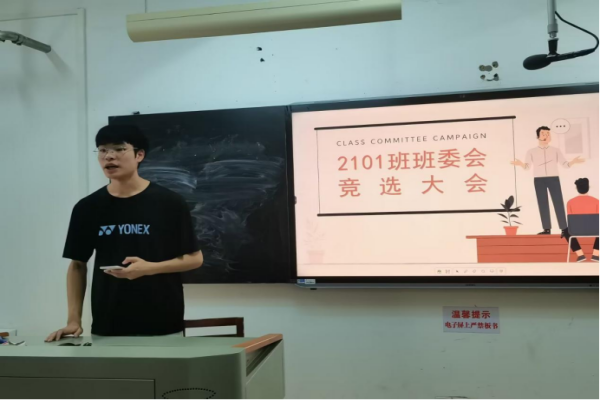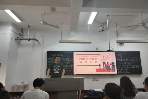 会议开始,前任班委依次上台发言,对自己的工作进行总结。班长和团支书组织同学们竞选班委职位,竞选人们上台做简短的自我介绍,并展示他们对工作的发展规划。经过民主投票,最终选出了新一届班委。2101班全体同学都表示对新班委的认可和支持,辅导员张婧和班导师徐凌分别表示了对新一任班委的祝贺。
