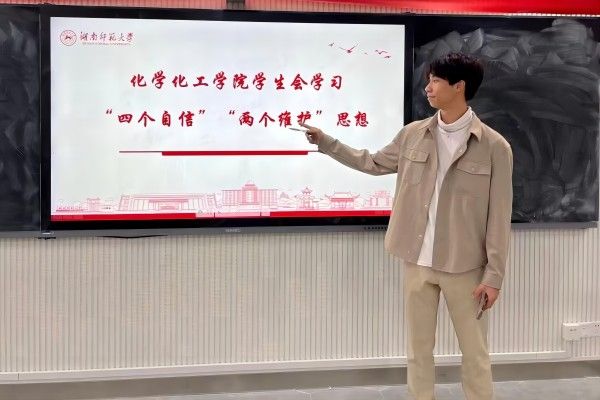 在此次学习中,谭进杰向学生会成员介绍了“什么是四个自信,什么是两个维护”。“四个自信”即道路自信、理论自信、制度自信、文化自信。“两个维护”即坚决维护习近平总书记党中央的核心、全党的核心地位;坚决维护党中央权威和集中统一领导。