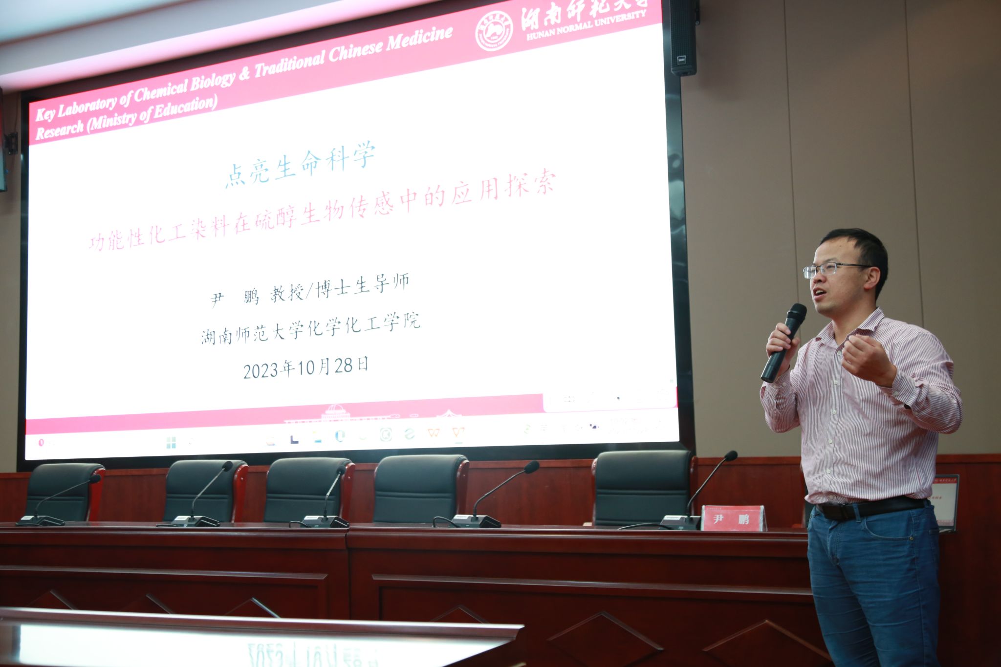 活动氛围在教授的活跃下逐渐轻松起来。然后尹鹏通过列举化工染料在生活和科研中的应用引出此次主题的同时,强调了化工对人们日常生活甚至其他学科的重大意义。讲解由四个部分组成:研究背景,多位点荧光探针同时区分Cys、Hcy和GSH,阿尔茨海默病和帕金森病中Cys、GSH和Hcy的同时荧光定量与成像研究,特异性检测Hcy的通用策略的构建与应用。