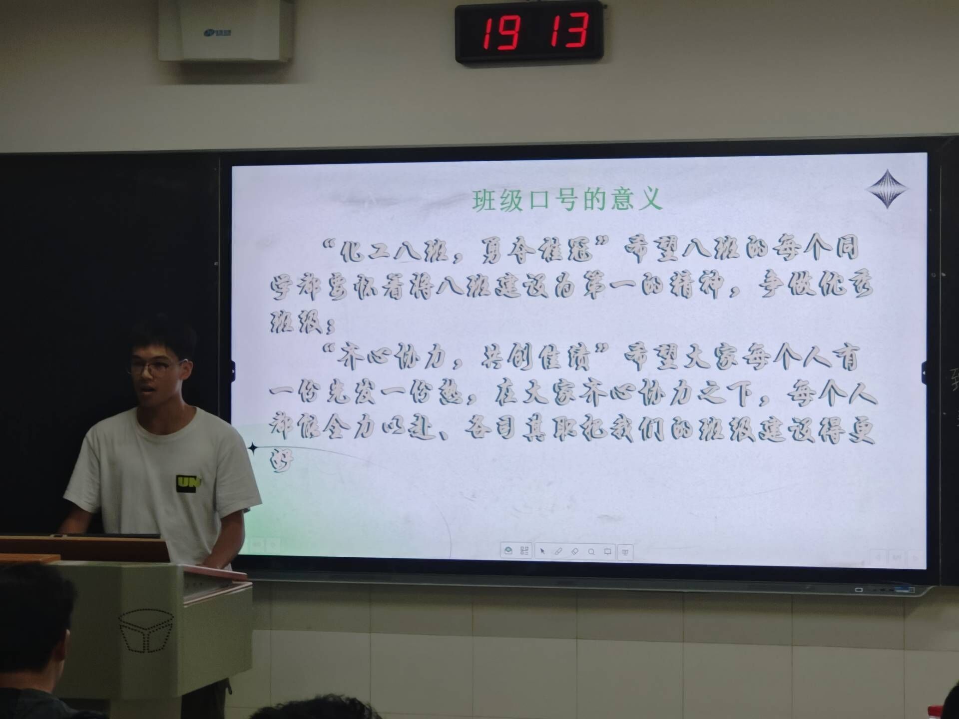 活动期间,主要以特色设计的提供者以PPT的形式讲解,由团支书主持。提供者说出自己的理念,设计它的理由,挑选它的意义。让同学们深刻理解这些班级特色设计的含义,这些设计是2308班精神风貌的体现,是对学习,生活的态度。活动尾声,由刘渝同学进行了一番点评,表达自己的感悟,想法。结尾的最后,是2308的对未来的期望。