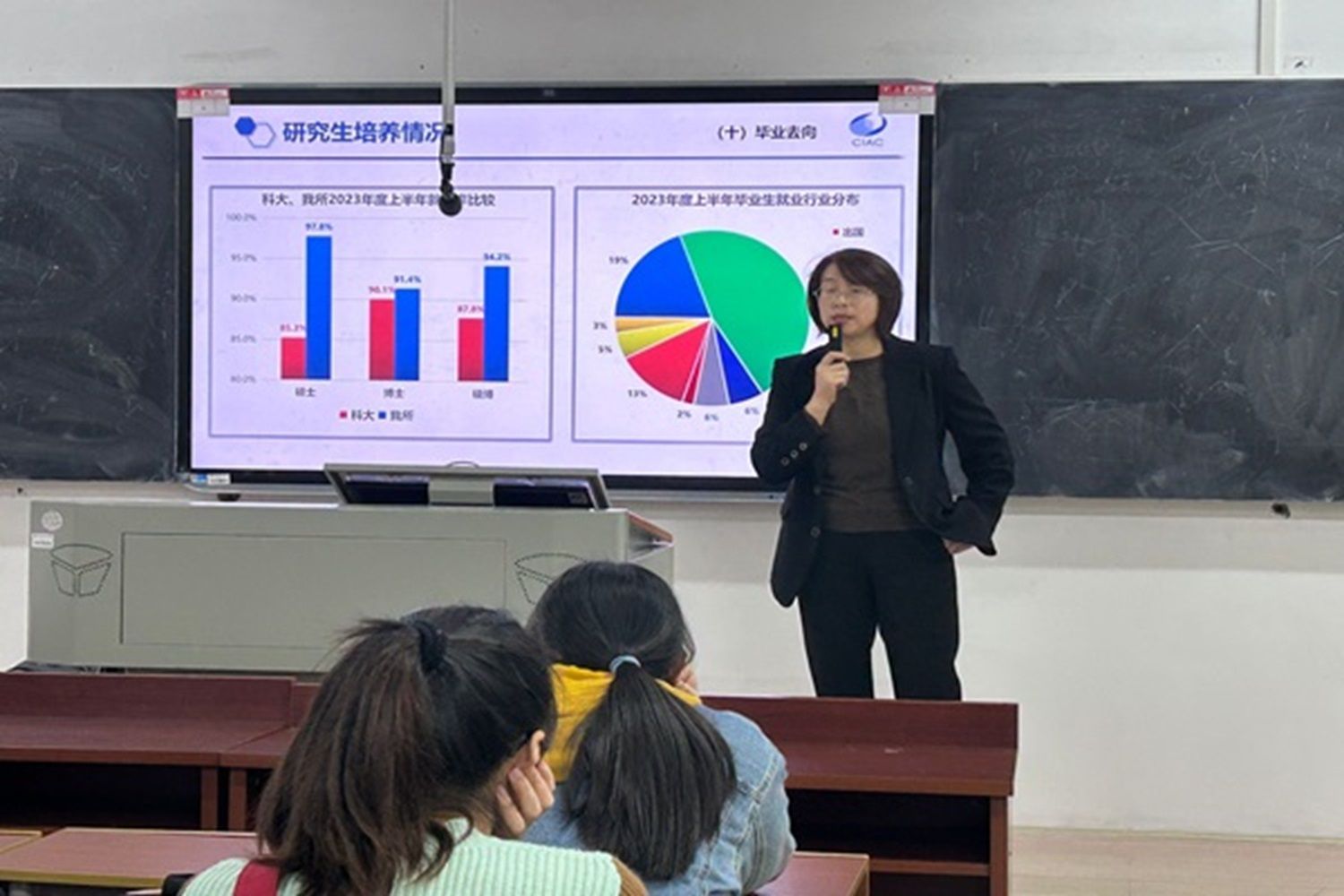 (通讯员 冉佳令)11月16日下午14时30分,中国科学院长春应用化学研究所在化工院219教室开展了2025年研究所招生宣讲会。教育处副处长李斐代表长春应用化学研究所进行招生宣讲,2021级化学师范、化学工程与工艺、制药工程专业部分同学参加此次宣讲会。