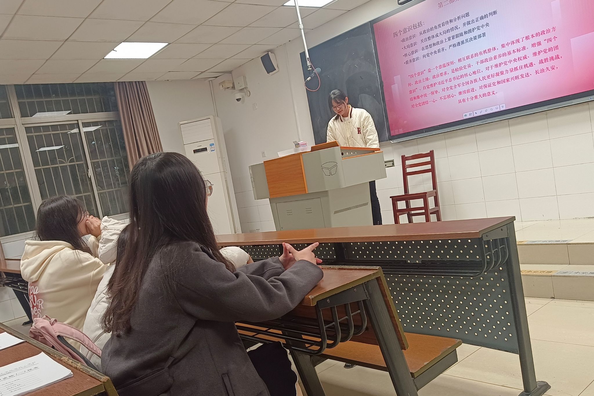 此次活动以幻灯片讲解、观看短视频和成员自由讨论相结合的方式开展。在正式学习理论前,吴凤玲先播放一个简短的视频引入主题,让成员们对学习贯彻习近平新时代中国特色社会主义思想主题教育工作会议精神有初步的了解,随后围绕“两个确立”、“四个意识”、“四个自信”和“两个维护”四个方面向成员们进行讲解和介绍。在活动最后的自由讨论环节,成员们都积极参与、各抒己见,表达自己在此次秋季理论学习活动中的收获和感悟。