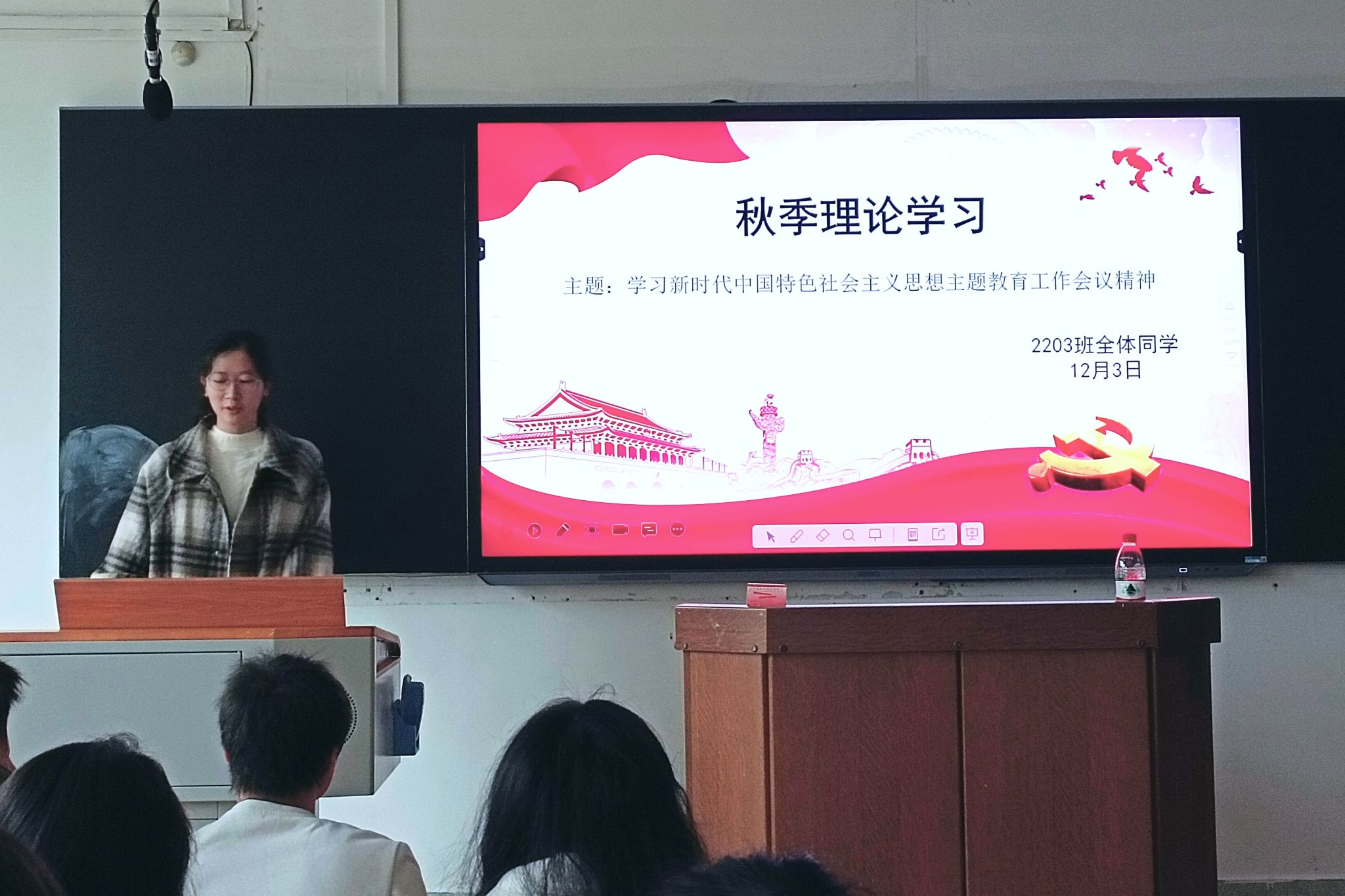 活动开始,宋子如介绍和讲解了思想主题教育工作会议上习近平讲话的内容,让同学们认识到了思想主题教育工作会议的重大意义,同时学习和感悟到了会议精神。为了巩固大家学习到的理论知识,随后展开了相关知识的竞答环节,通过一道道题目的练习,加深了同学们对会议内容和精神的理解。此次活动以相关问题讨论结尾,一些同学在此环节举手发言表达了自己的见解,此讨论环节不仅启发了同学们的思考,还坚定了同学们不断学习党的先进理论思想的决心。