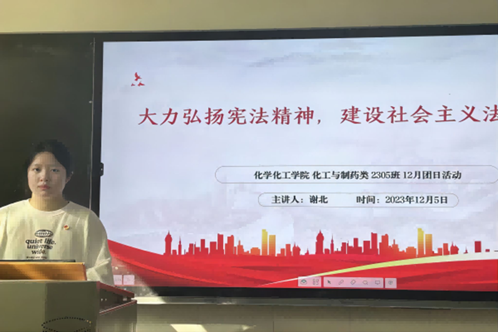 (通讯员 谢北)12月5日10时10分,伟德国际1949化工与制药专业2305团支部在团支书谢北的组织下于至善楼306教室开展12月“大力弘扬宪法精神,建设社会主义法治文化”主题团日活动。