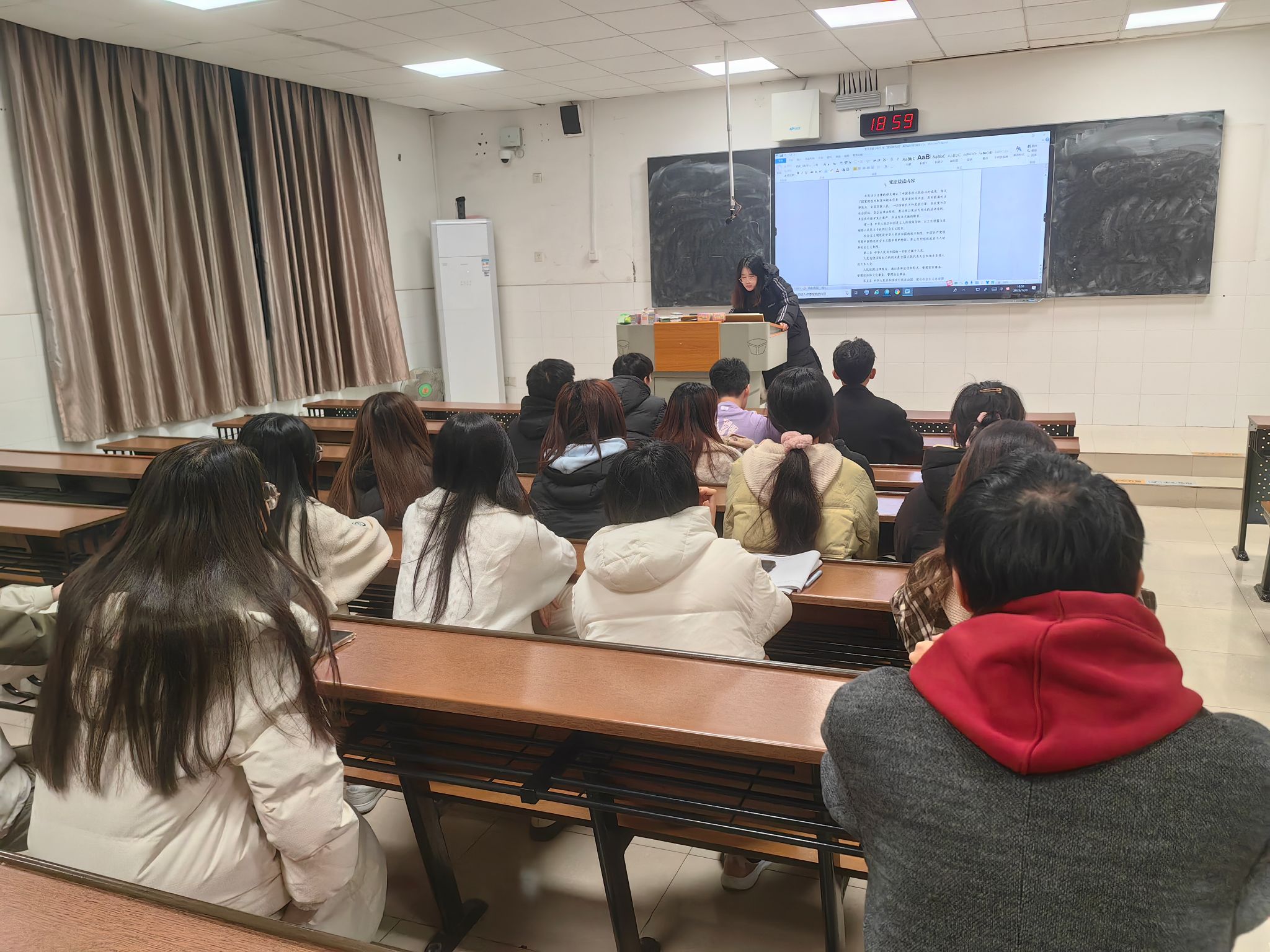 此次活动开始,团支书藏轩彤向2205班全体同学宣传习近平新时代中国特色社会主义思想,特别是习近平法治思想、习近平总书记关于宪法的重要讲话和重要批示。在藏轩彤发言完毕后,班长刘佳桐领唱歌曲《宪法伴我们成长》。在刘佳桐的领唱下,2205班全体成员进行《宪法伴我们成长》歌曲传唱。这首歌很好的传播了宪法知识,其中体现的宪法精神让同学们受益匪浅。活动中,同学们分为三个小组,分词传唱,让同学们都能够参与到活动中,增强了活动的互动性和趣味性。