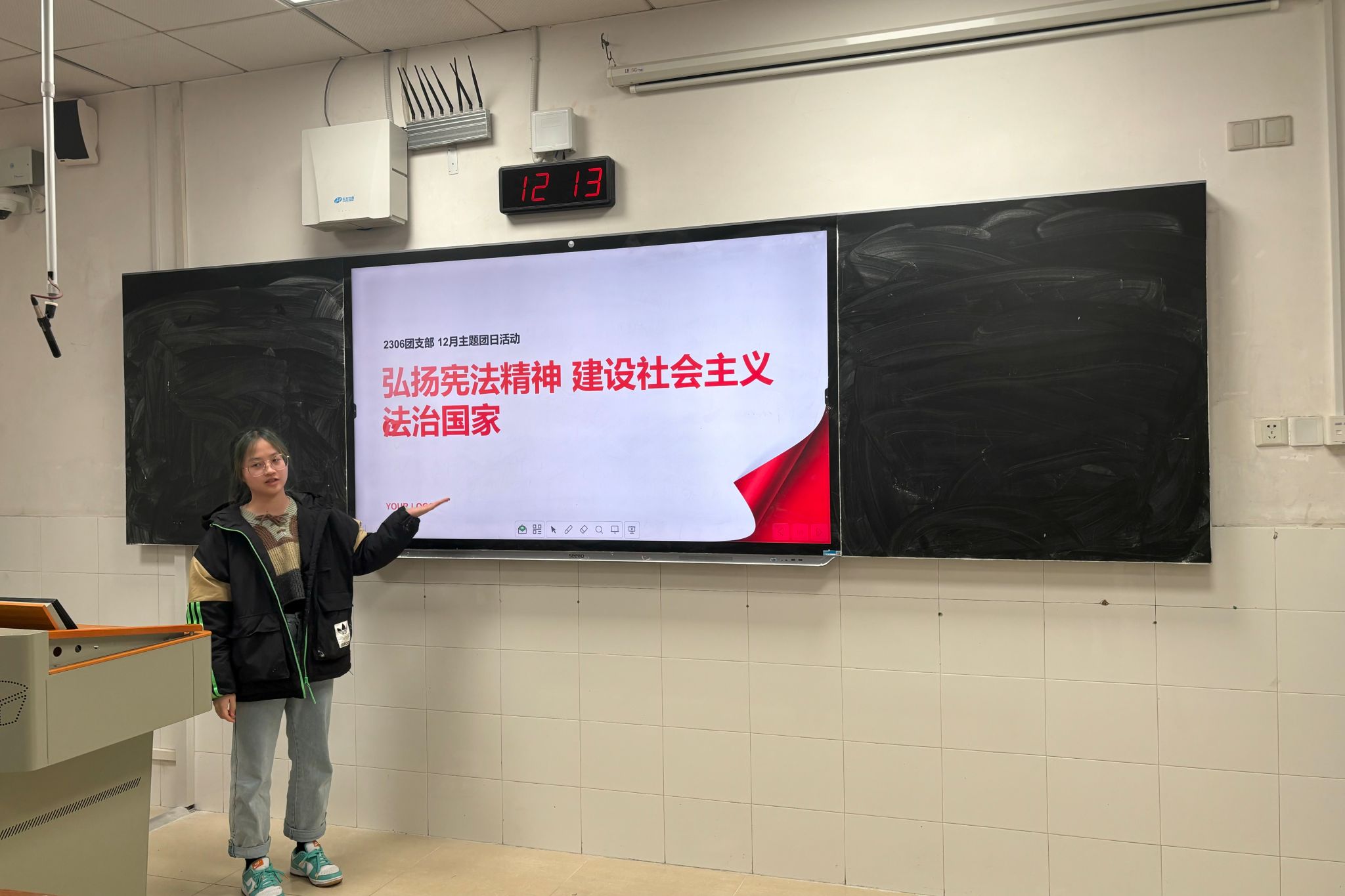 活动伊始,邵菁逸介绍了此次团日活动主题——大力弘扬宪法精神,建设社会主义法治文化。从宪法的地位、意义等多角度出发,邵菁逸阐述了相关内容,同时结合现实生活中的真实案例,展示了宪法的重要性。此次团日活动的开展,旨在普及宪法知识,提高学生对宪法的认知。在日常生活中,学生可以采取多种形式来提高个人宪法意识,砥砺社会主义法治文化精神。时代发展,挺膺担当,不负使命,强国有我,主题教育第四专题——挺膺担当,双线并行同时召开。