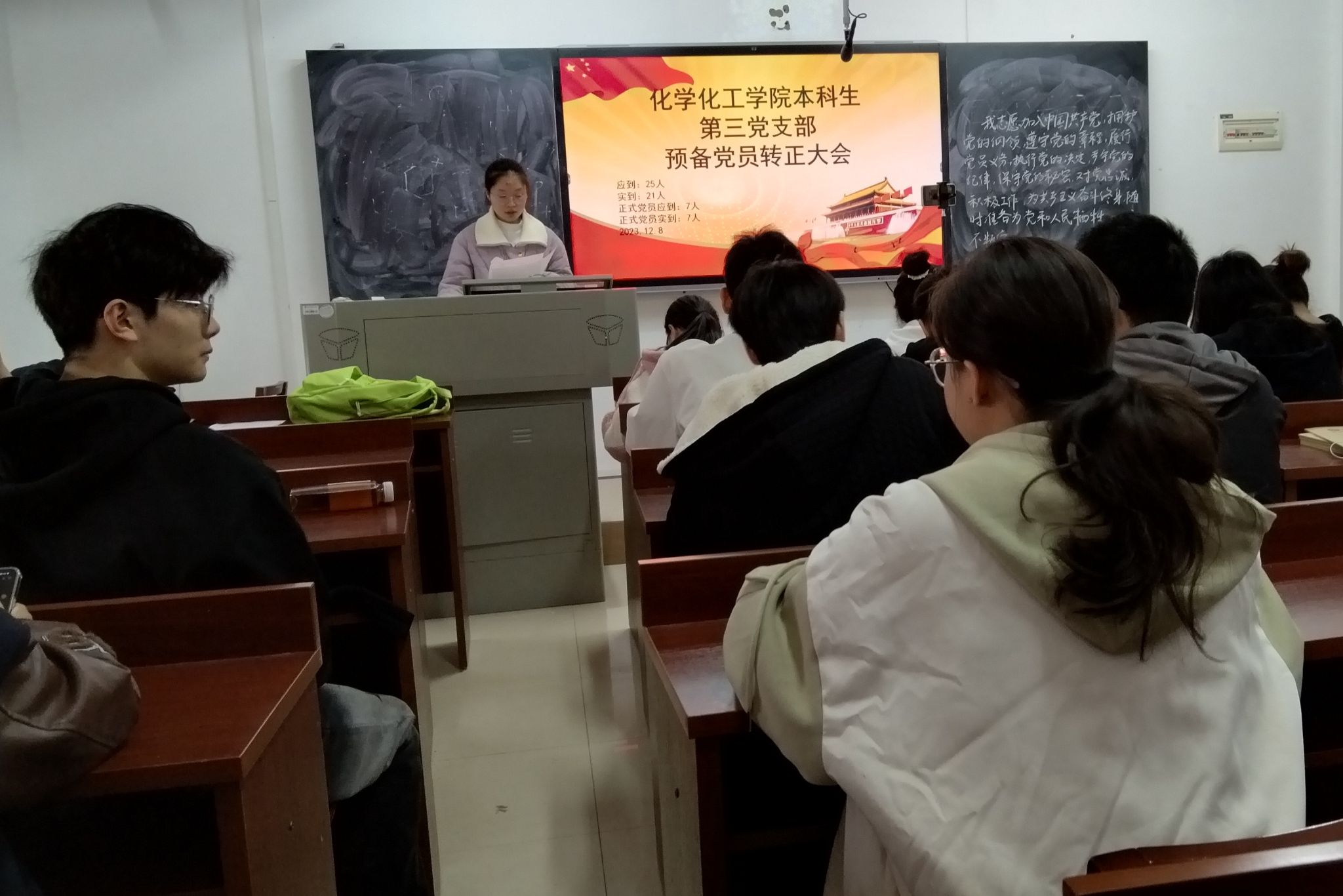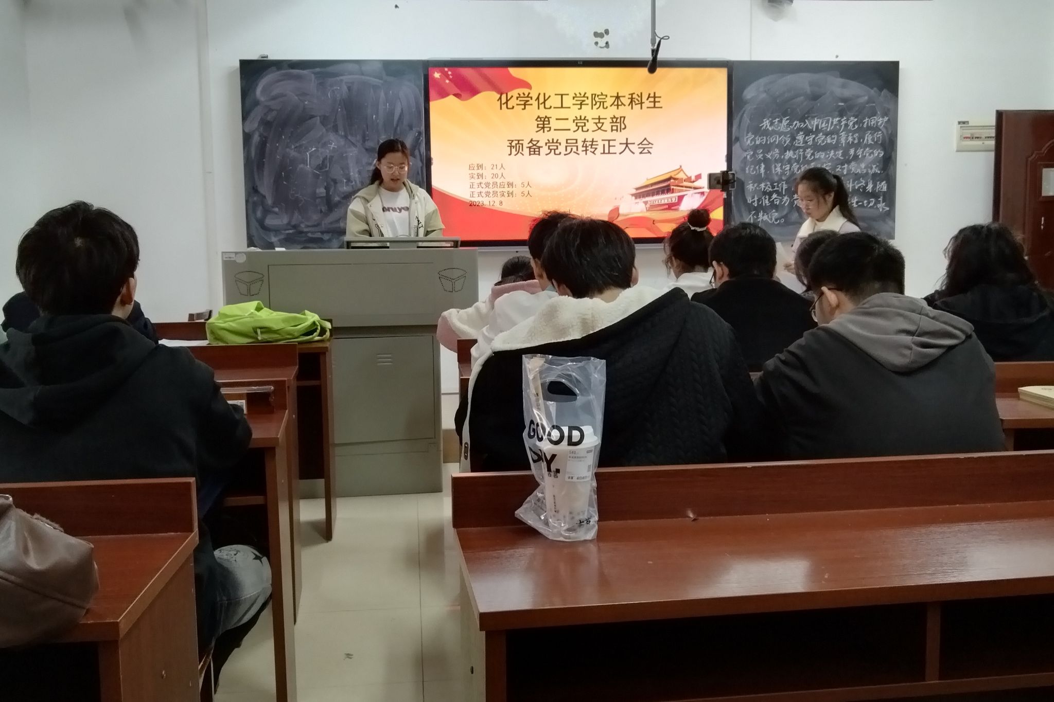 表决结束后,唐健清同志发表简短讲话,从党员同志的思想作风方面指出要加强党员队伍的建设,要求各位党员同志在往后生活中严于律己,不忘初心,做一名优秀的共产党员。会议最后,由余思宇同志领誓,全体党员同志面向党旗宣读入党誓词。