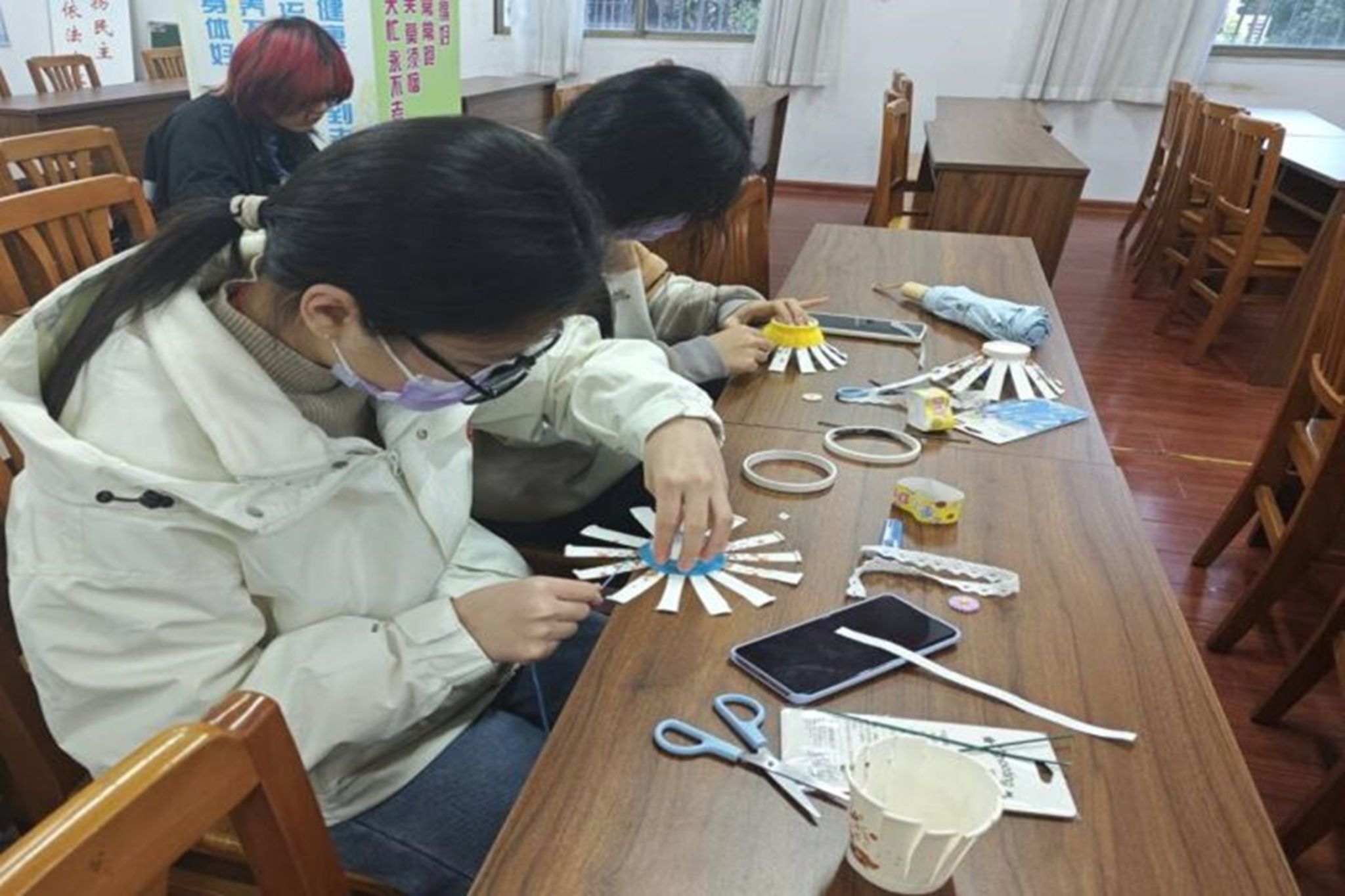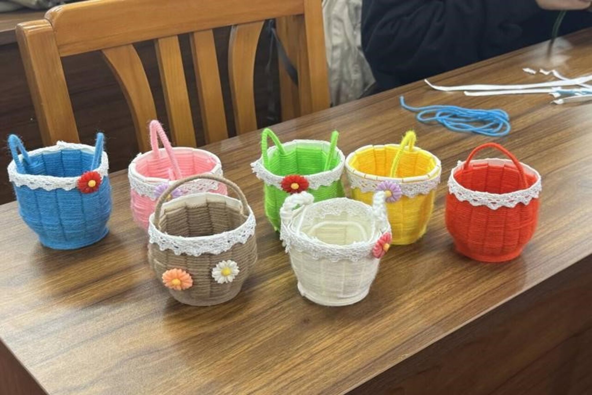 此次活动由绘心民俗社理事李思仪主持,其余理事会成员负责活动准备和现场布置。活动过程中,志愿者们积极参与,提前学习了微信群中发布的活动教程。志愿者们将纸杯平均剪成13份,在纸杯底部用双面胶绕上一圈,再将毛线从纸杯底端绕至顶端,最后将花边在顶口缠上一圈,并插上已经绕好毛线的花杆做成提手。在活动最后,志愿者们带着小朋友拿着自己的作品,在社区门口合照留念,记录下了愉快的时刻。