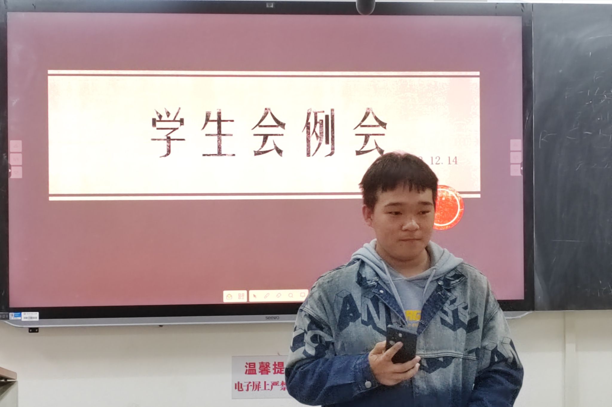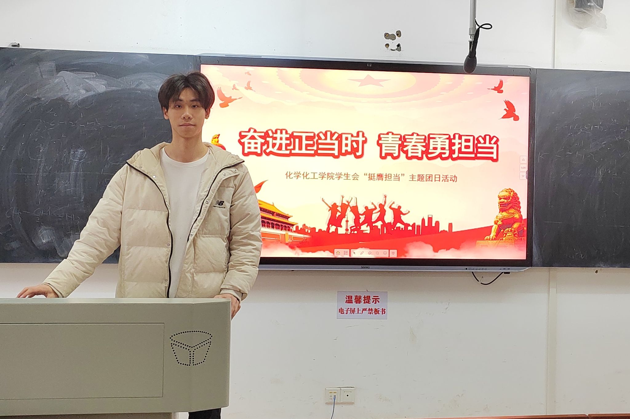 各部门工作汇报完毕后,谭进杰主持开展了“挺膺担当”专题团日活动。谭进杰以习近平总书记对于青年担当的讲话开启本次活动,并结合学生会现状及未来发展走向,向全体成员说明此次主题学习的必要性。新时代青年当立报国之志,传承以爱国、进步、民主、科学为主要内容的五四精神。对此,谭进杰强调青年应担当时代的重任,展望未来,砥砺前行,树立远大理想,掌握专业知识并提升自身本领。在最后,谭进杰要求学生会成员在日常工作中恪尽职守,一丝不苟地对待并完成每一项工作。