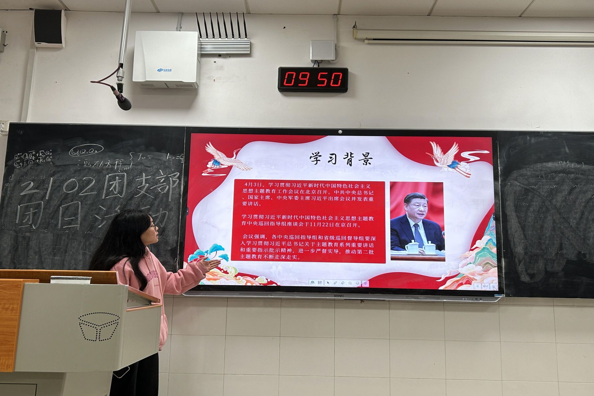 向梦圆为同学们简要介绍了习近平总书记在学习贯彻习近平新时代中国特色社会主义思想主题教育工作会议上的重要讲话,引入了宣传贯彻习近平总书记重要讲话精神的政治、理论、实践三大重要意义。同学们从习近平总书记的青年观着手,深刻领会习近平总书记关于青年工作的重要思想的理论内涵和实践要求,明确了身为青年,时代赋予我们的使命与重任。向梦圆号召同学们作为新时代的青年,要从习近平新时代中国特色社会主义思想中汲取奋发进取的智慧和力量,并将其转化为坚定理想、指导实践、推动工作的强大力量。