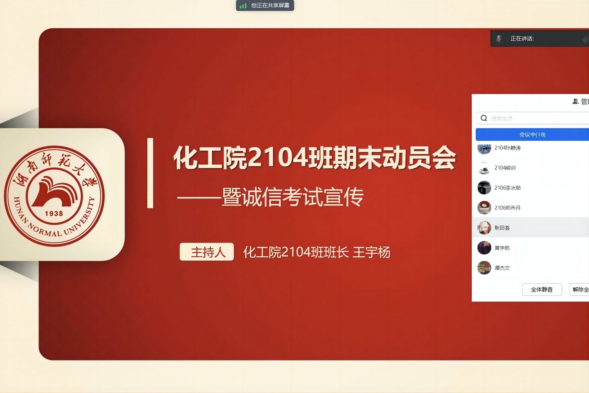 (通讯员 王宇杨)12月20日19时30分,伟德国际19492104班全体同学通过线上会议方式开展了2023-2024学年上学期期末考试动员班会暨诚信考试宣传会议,此次会议由班长王宇杨主持。