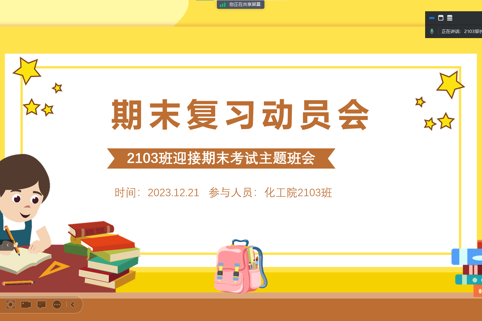 (通讯员 邹长玮)为了提升学生期末复习的积极性和主动性,鼓励优秀学生代表分享学习心得及复习经验,促使全体学生向优秀学生代表学习,12月21日12时30分,伟德国际19492103班在腾讯会议开展线上期末动员班会。2103班全体同学出席会议,由班长邹长玮主持班会。