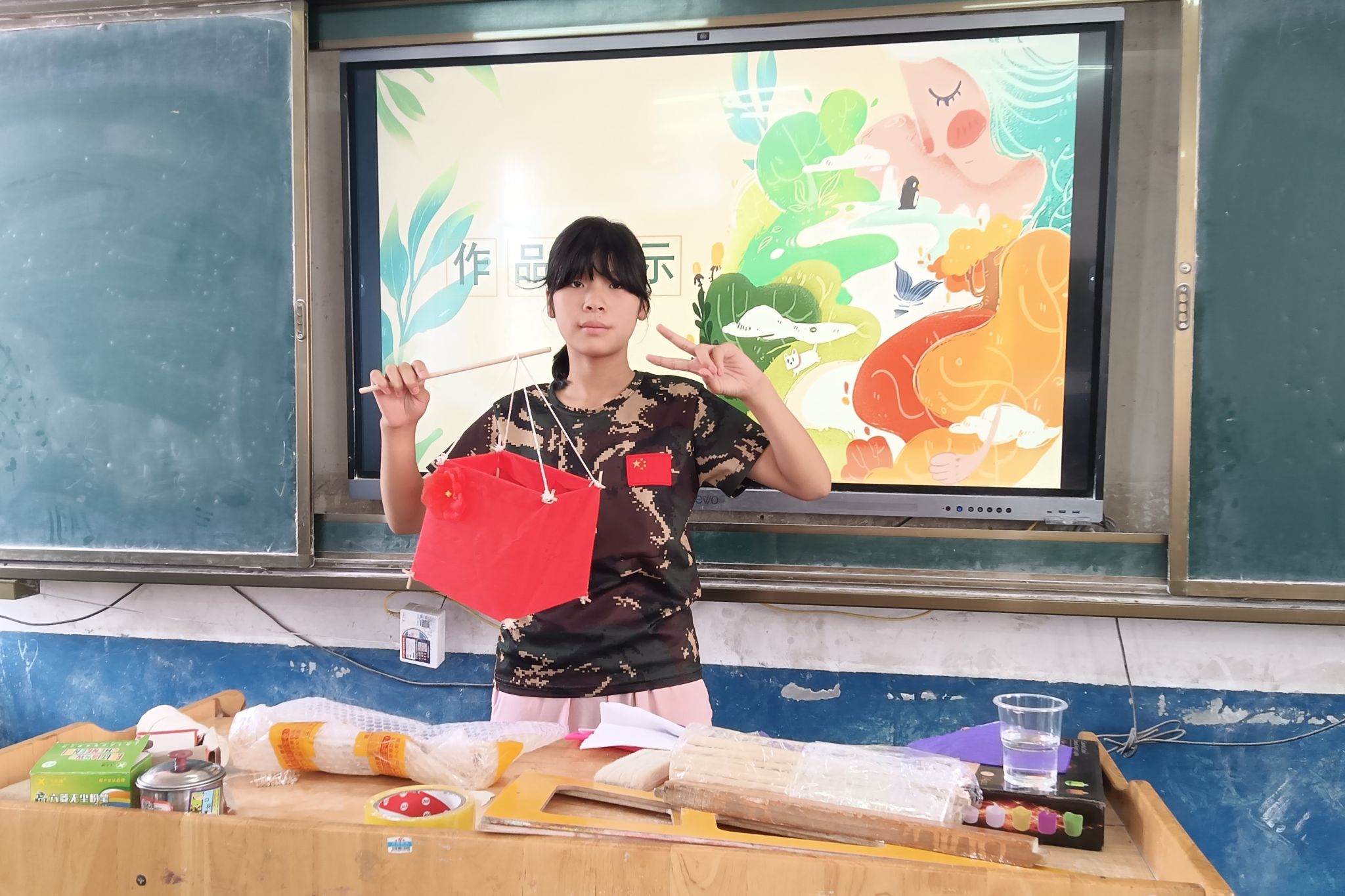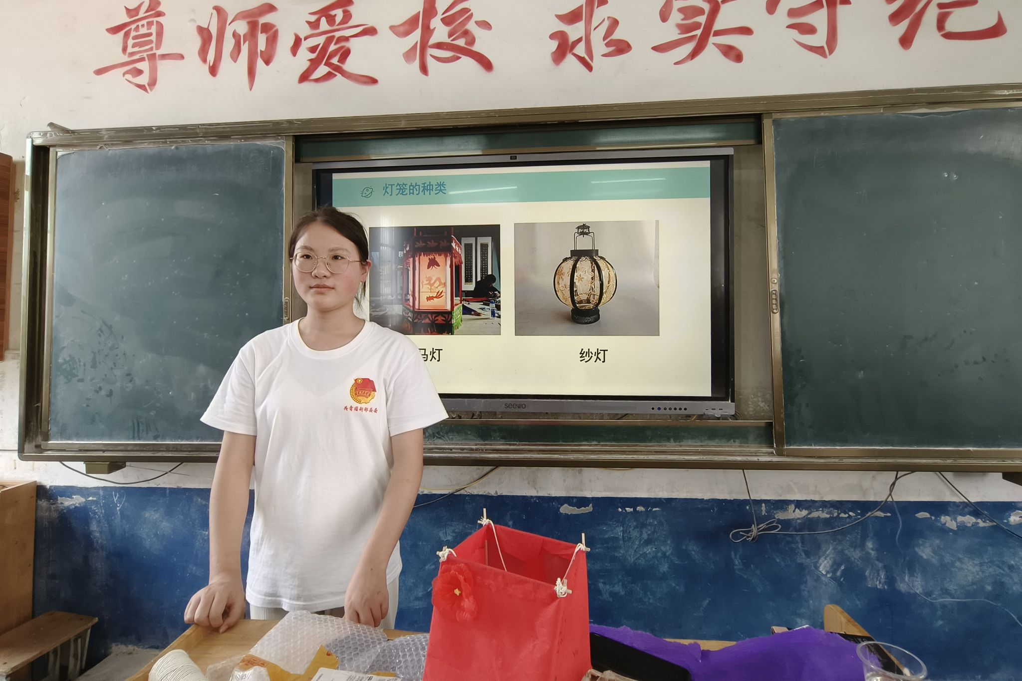 课堂伊始,邹慧媚向大家介绍了灯笼的来源。她介绍道,灯笼是美好寓意的象征,放花灯的习俗流传久远,灯笼的种类也各不相同。随后,她向学生展示了宫灯、纱灯、走马灯等不同种类的灯笼,通过各种图片激发了学生对灯笼的兴趣。分发材料后,学生们纷纷拿起木棍和棉线绳开始制作。遇到困难时,同学们互帮互助、交流讨论,及时向老师求助,课堂效率较高。制作结束后,邹慧媚让学生上台展示自己的作品。不少学生主动举手,积极上台发言,手工的获得感与成就感得到增强。