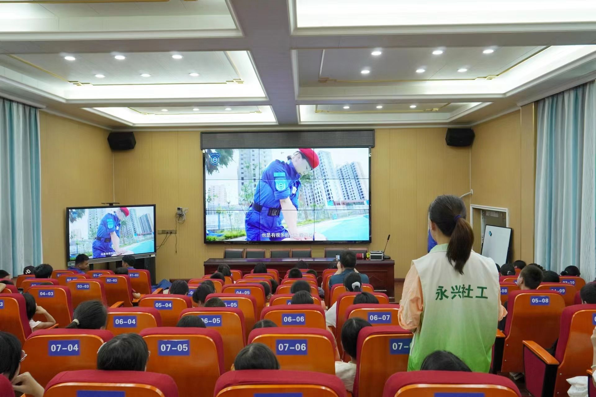 “麓山青年”暑期实践队队员和蓝天救援队队员通过播放溺水案例,从身边的事故切入,提醒同学们防溺水的重要性,并阐明了少年儿童溺水的严重危害性。讲解员通过列举各种危险行为向同学们敲响了警钟,同时也普及了几种常用的应急处理措施。蓝天救援队队员展示了发生溺水事故应如何进行救护,演示了心肺复苏的步骤,强调了心肺复苏适用情况和注意事项并与现场的师生们进行了互动演练。同学们对此感触颇深,安全防范意识和风险应对能力都得到了增强。