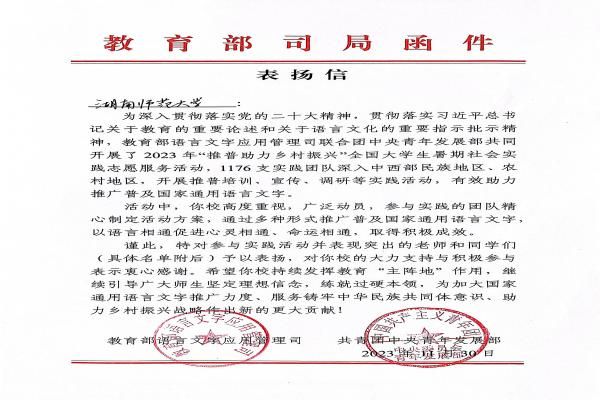 此次教育部语言文字应用管理司、共青团中央青年发展部的表扬信,充分肯定了化工院多年来对推广普及国家通用语言文字工作的高度重视,广泛动员。未来,化工院将继续扎实推进实践育人工作,引导学生把课堂学习和社会实践紧密结合起来,在实践大课堂接受教育、经受锻炼、增长才干,为加大国家通用语言文字推广力度、铸牢中华民族共同体意识、助力乡村振兴战略作出新的贡献。