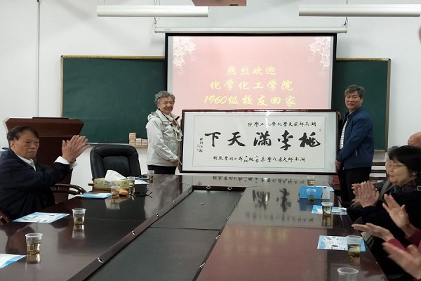座谈会结束前,60级校友们给学院赠送了一副“桃李满天下”的牌匾,感恩母校的培育之情。