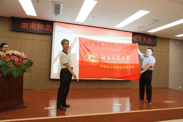 于风江授会旗,彭正乔、于风江、耿自强、尹笃林向岳阳校友会名誉会长、正副会长、正副秘书长颁发聘书。随后,岳阳校友会首任会长刘立新向第一届理事会理会颁发聘书。
