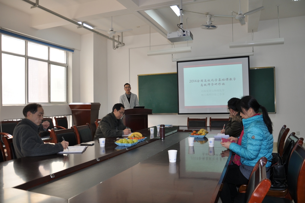 随后,青年教师周文理博士报告了2014年参加全国高校化学基础课教学高级师资研修班的学习情况,着重介绍了周公度、黄建滨老师在《结构化学》、《物理化学》方面的教学经验与体会。周公度老先生的“自勉三字经”以及黄建滨老师提出的“悟理化学、理科文讲”都给与会老师留下了深刻的印象。