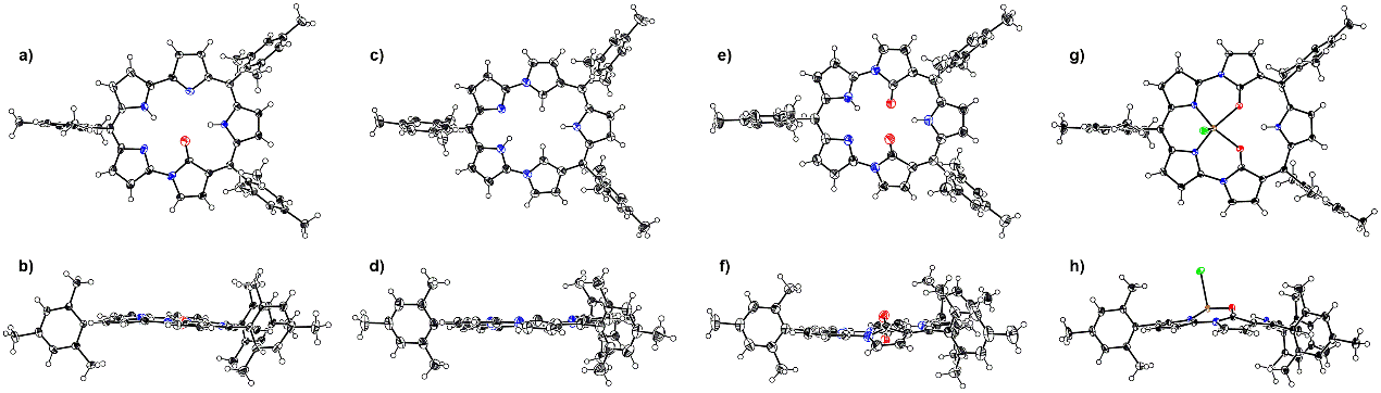 a), b); c), d); e), f); g), h)分别为化合物17, 18, 19, 19Cu的晶体结构(俯视图和侧视图)