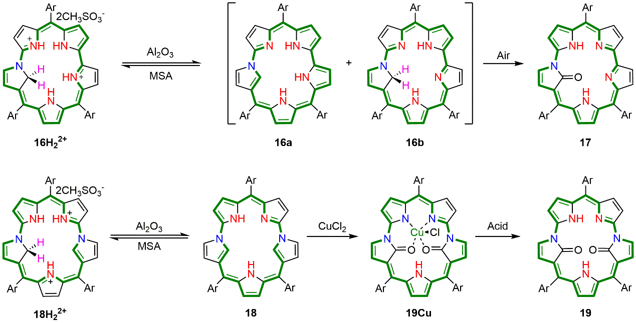 该课题组于2018年首次报道合成了全氮smaragdyrin,揭示了全氮smaragdyrin存在之谜、发现了其芳香性与反芳香性相互转化的内在规律(J. Am. Chem. Soc.,2018, 140, 16533)。基于前期工作,课题组进而合成了全新结构的smaragdyrin类似物neo-confused smaragdyrin。采用氮错位三吡咯甲烷(10和11)与α-溴代氟硼二吡咯烯(BODIPY)为原料,在碱存在下通过亲核取代成环-脱氢形成稳定的芳香性大环化合物Neo-confused smaragdyrin 13和15,经甲磺酸脱BF2单元可顺利得到自由碱neo-confused smaragdyrin16和18。16和18在酸性条件下可质子化形成16H22+和18H22+,16在空气中可以顺利氧化为[22]oxosmaragdyrin 17。18与CuCl2反应可高产率得到[24]dioxosmaragdyrin Cu(II) complex 19Cu,经酸处理脱去金属得到doubly neo-confused [24]dioxosmaragdyrin19。研究发现neo-confused smaragdyrin相对于全氮smaragdyrin而言,具有递减的芳香性、独特的氧化还原性能以及金属络合性能。论文实验部分工作主要由博士研究生饶玉滔同学完成(饶玉滔同学在伟德国际victor1946攻读学位期间作为第一作者累计发表校定TOP期刊论文两篇Angew. Chem. Int. Ed.,2016, 55, 648; J. Am. Chem. Soc.,2019,141. doi/10.1021/jacs.9b10270, 另外发表Chem. Eur. J, 2016, 22, 8801.一篇),硕士研究生周文静协助完成了部分工作。