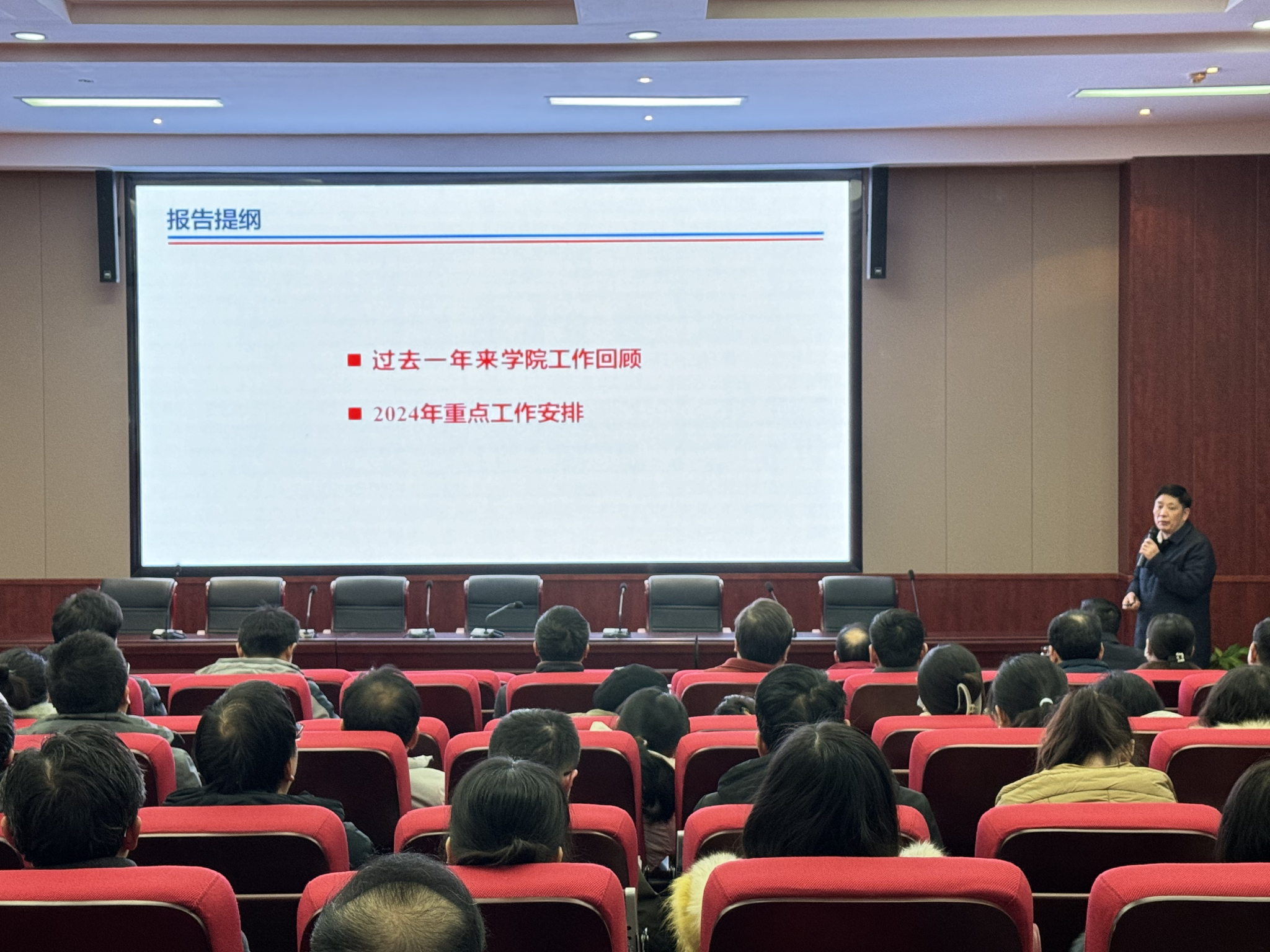 杨荣华作2023年学院工作报告。他表示,回顾过去一年来的工作,在校党委行政的正确领导下,全院教职员工共同努力,提高教学、科研水平和管理能力,不断改善办学条件,学院各项工作取得新进展。同时从党建工作、人才培养、伟德国际等方面对2024年的主要工作提出了具体要求。